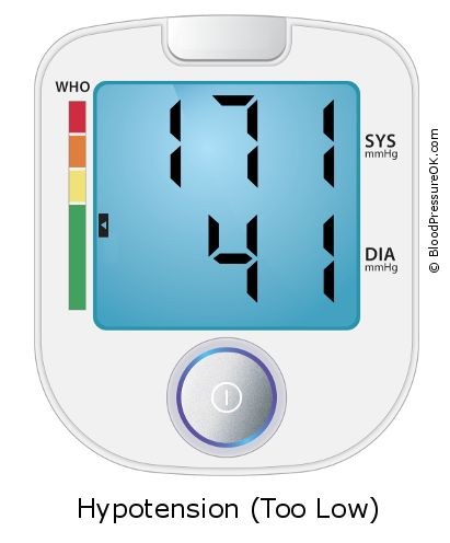 Requirement for a blood pressure Hypertension Stage 2 is a value of 160-179 over 100-109. Your blood pressure of 171/41 falls into this range.