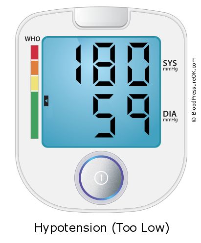 Your blood pressure reading of 180/59 indicates Hypertension Stage 3. It is the most severe case of high blood pressure and usually needs immediate attention by a doctor or health care professional. It is also referred to as Hypertensive Crisis.