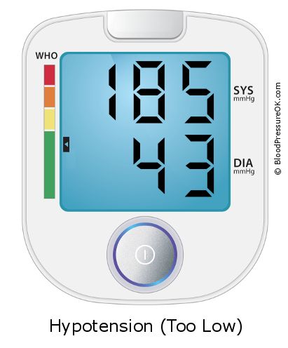 Your blood pressure reading of 185/43 indicates Hypertension Stage 3. It is the most severe case of high blood pressure and usually needs immediate attention by a doctor or health care professional. It is also referred to as Hypertensive Crisis.