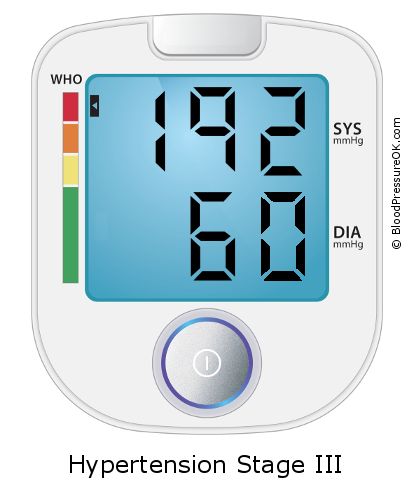 Requirement for a blood pressure Hypertension Stage 3 is a value of over 180/110. Your blood pressure of 192/60 falls into this range.